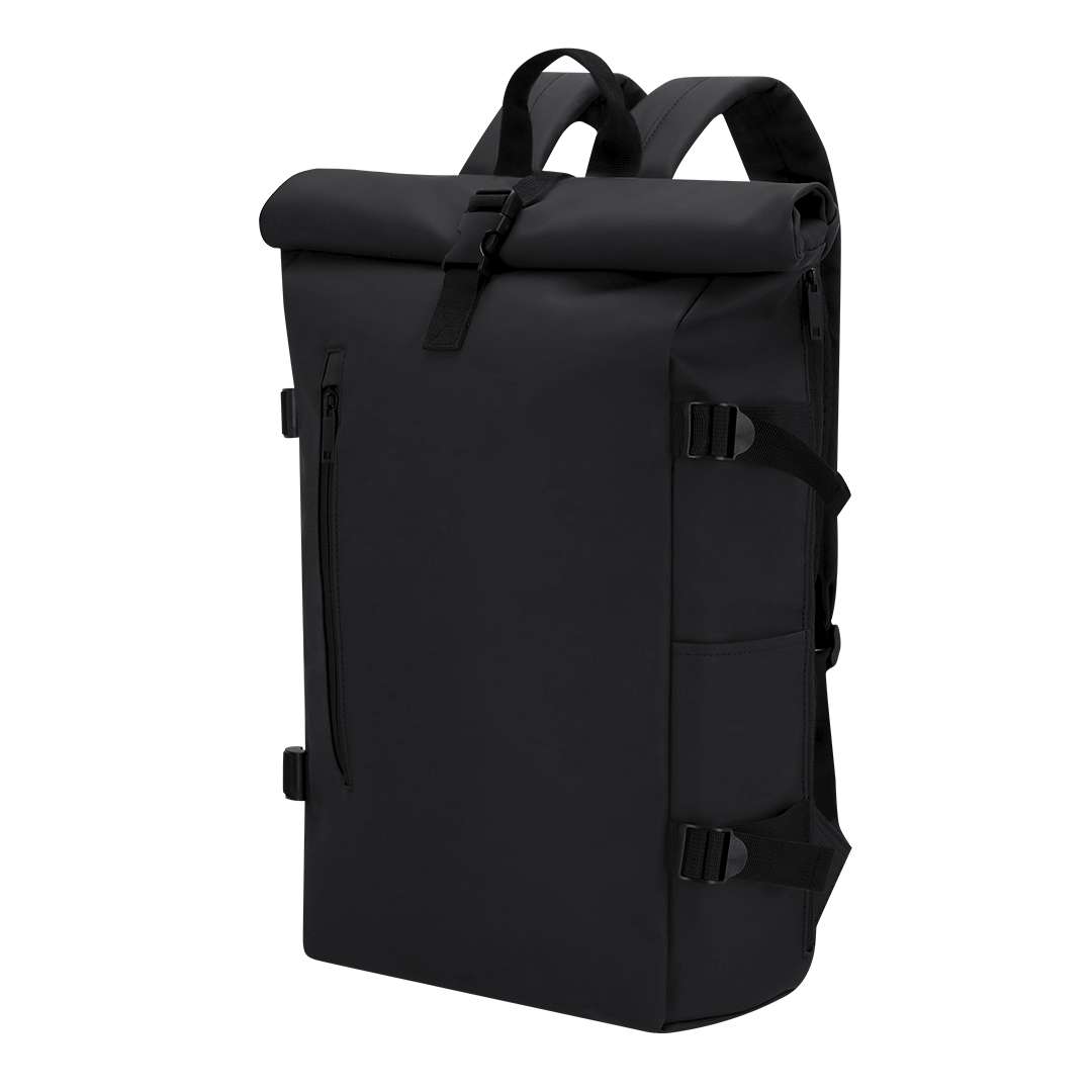 Zaino realizzato in morbido PU con chiusura arrotolata con zip e fibbia. Dotato di una tasca frontale e di una tasca posteriore con accesso laterale, entrambe con cerniere invisibili, oltre a due tasche laterali aggiuntive. Ampio scomparto interno con vano imbottito per laptop fino a 15 pollici. Cinghie laterali regolabili per compattare il volume secondo necessità. Spallacci in PU e schienale imbottito per un maggiore comfort. Cinghia pettorale con fibbia per una chiusura sicura. Include fascia posteriore per il fissaggio a trolley o valigia, ideale per viaggi e spostamenti.