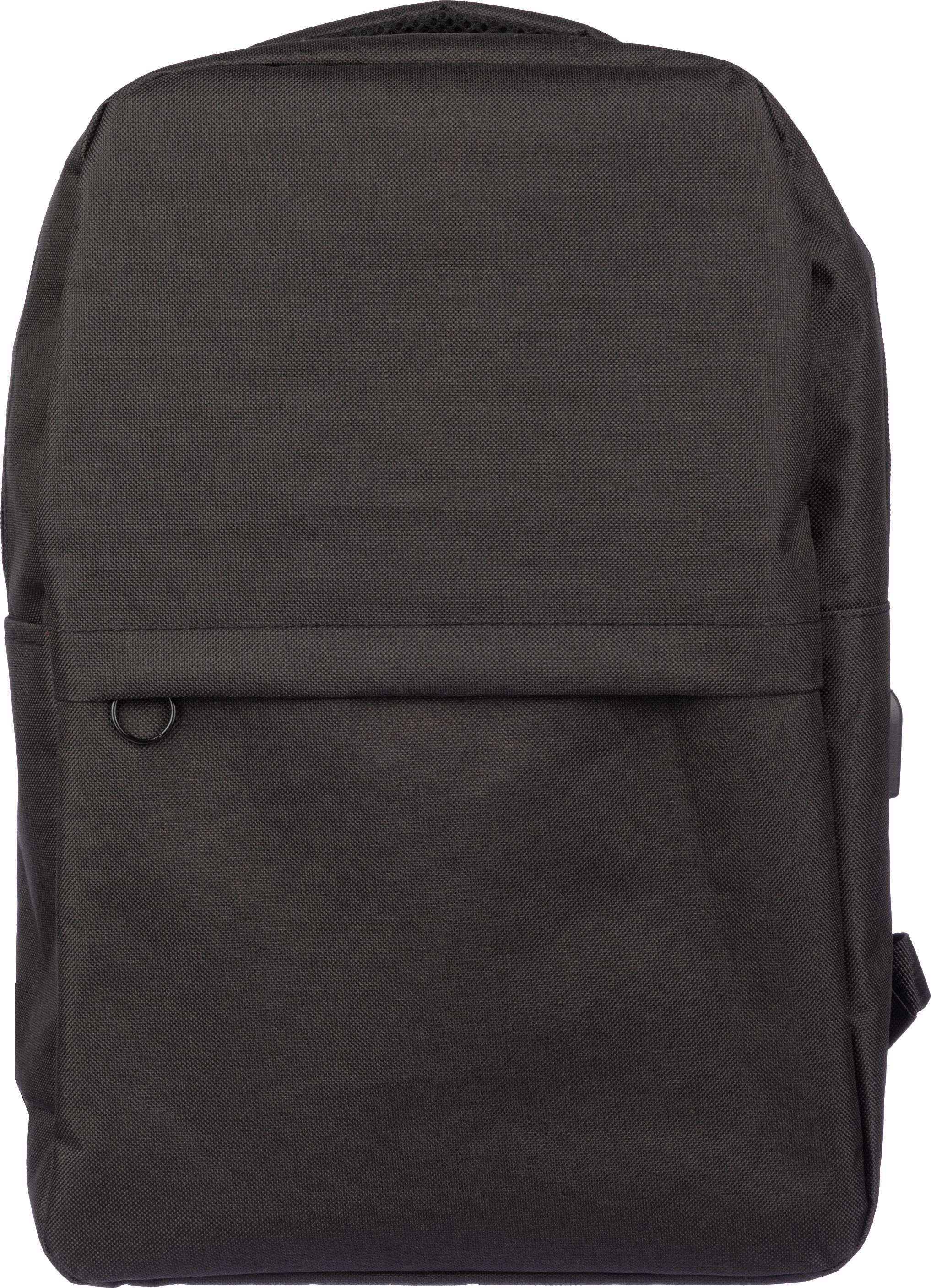 Zaino portacomputer da 15 pollici in rPET 600 D, sul lato porta USB con cavo all’interno, ampio scomparto sul lato superiore e tasca sul lato anteriore con chisusura lampo, all’interno è presente uno scomparto per dispositivi da 10 pollici e uno per dispositivi da 15 pollici, spallacci regolabili