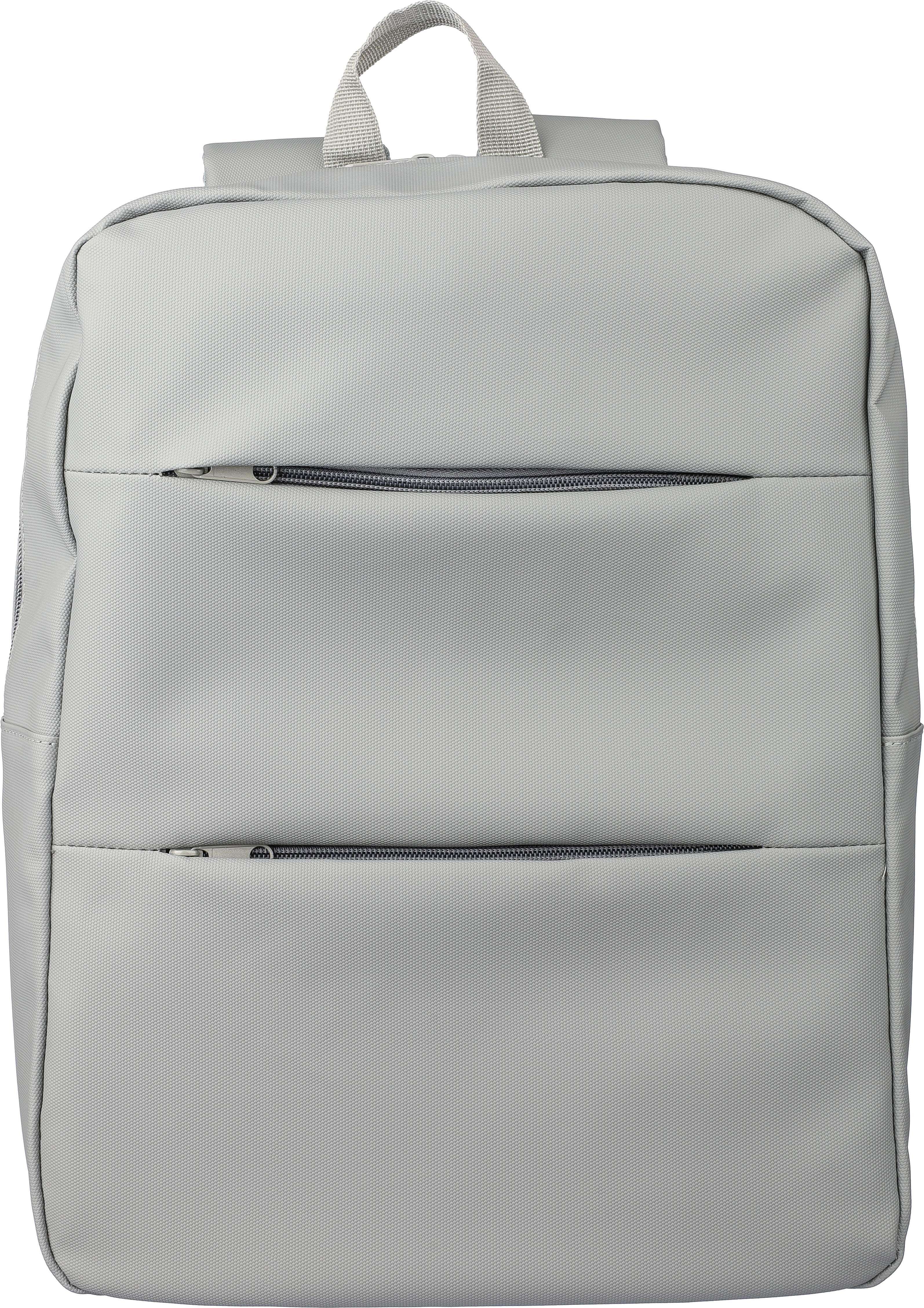 Zaino portacomputer in PU da 15 pollici, include due tasche anteriori con chiusura lampo, ampio scomparto con chiusura lampo, vano per il laptop con chiusara a velcro, molteplici inserti interni, schienale ventilato ed imbottito, cintura per trolley, spallacci regolabili, idrorepellente