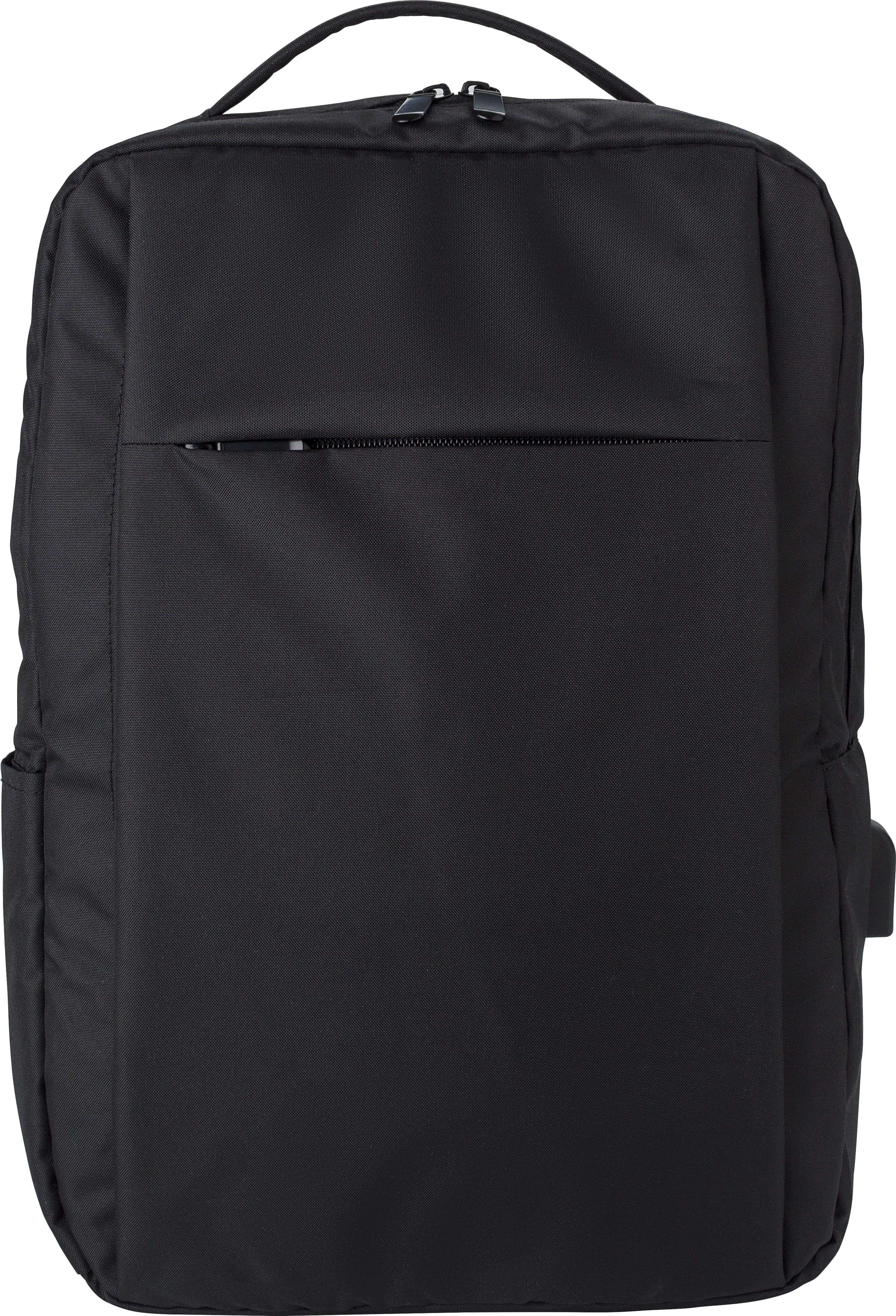 Zaino portacomputer in rPET 300 D, dettagli 210 D, adatto per un laptop da 16 pollici con chiusura in velcro, interno con tasche multiple, scomparto frontale con chiusura lampo, sul lato porta USB con cavo all'interno