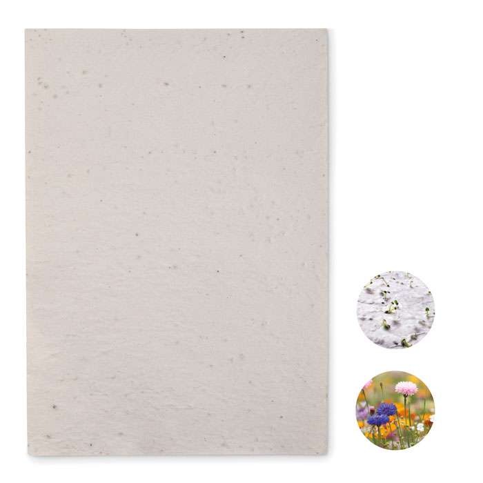 Foglio di carta riciclata con semi di fiori selvatici in formato A4 (80 gr/m²). Prodotto in UE.