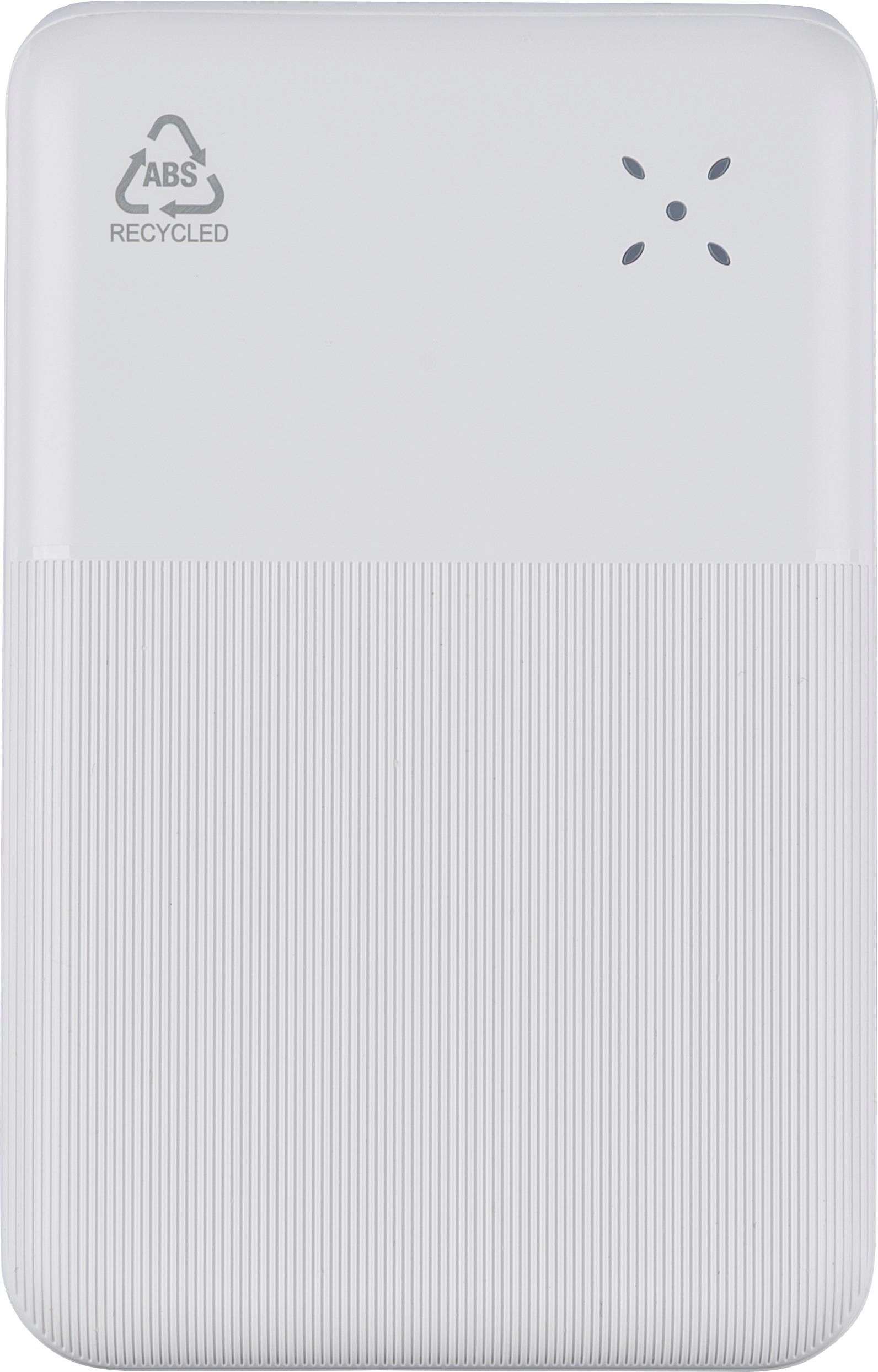Powerbank in ABS riciclato con batteria Li-ion da 20.000 mAh e ricarica rapida da 22,5W, dispone di ingresso/uscita Type-C, ingresso Type-A e indicatore LED per lo stato della batteria, dotato di protezioni contro surriscaldamento, cortocircuito, sovratensione e sovracorrente, include etichetta sul retro con il logo ABS riciclato. Confezionata singolarmente in una scatola in cartone avana avvolto in carta velina all'interno.