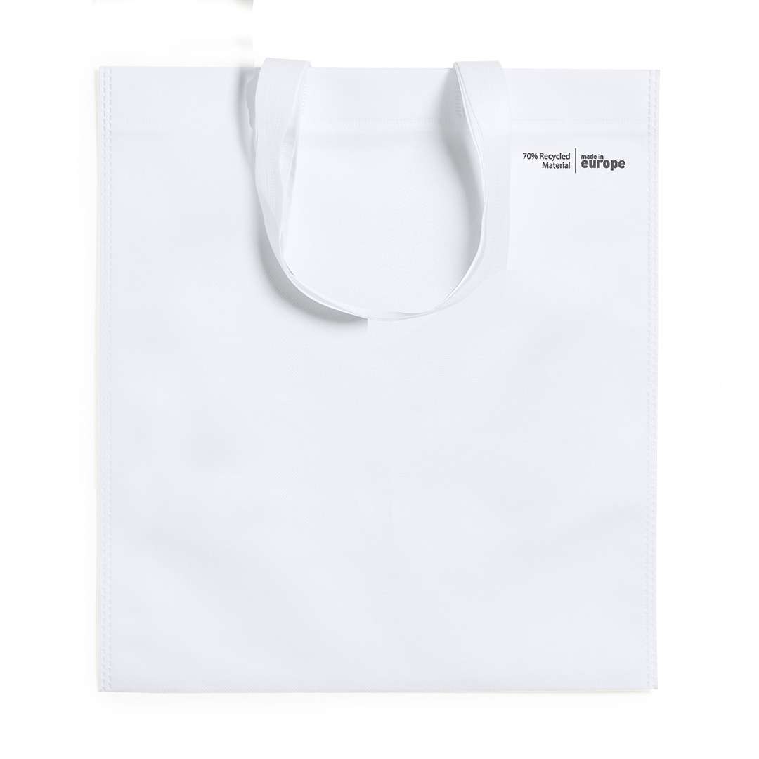 Borsa della linea Nature in materiale non woven riciclato da 70 g/mq. Fabricatto in Europa, con finitura termosaldata, manici corto e stemma eco/made in sulla borsa.