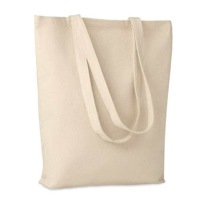 Shopper in tela con manici lunghi e con soffietto sul fondo. Una borsa ideale per la spesa quotidiana. I lunghi manici ne facilitano il trasporto, si può tenere a mano o sulla spalla. Il soffietto sulla base consente di trasportare più oggetti rispetto a una borsa di forma normale. 270gr. Questo prodotto è certificato OEKO-TEX® STANDARD 100.