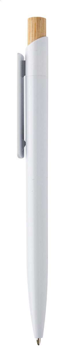 Penna a sfera in plastica ABS riciclata con pulsante in bambù e refill blu.