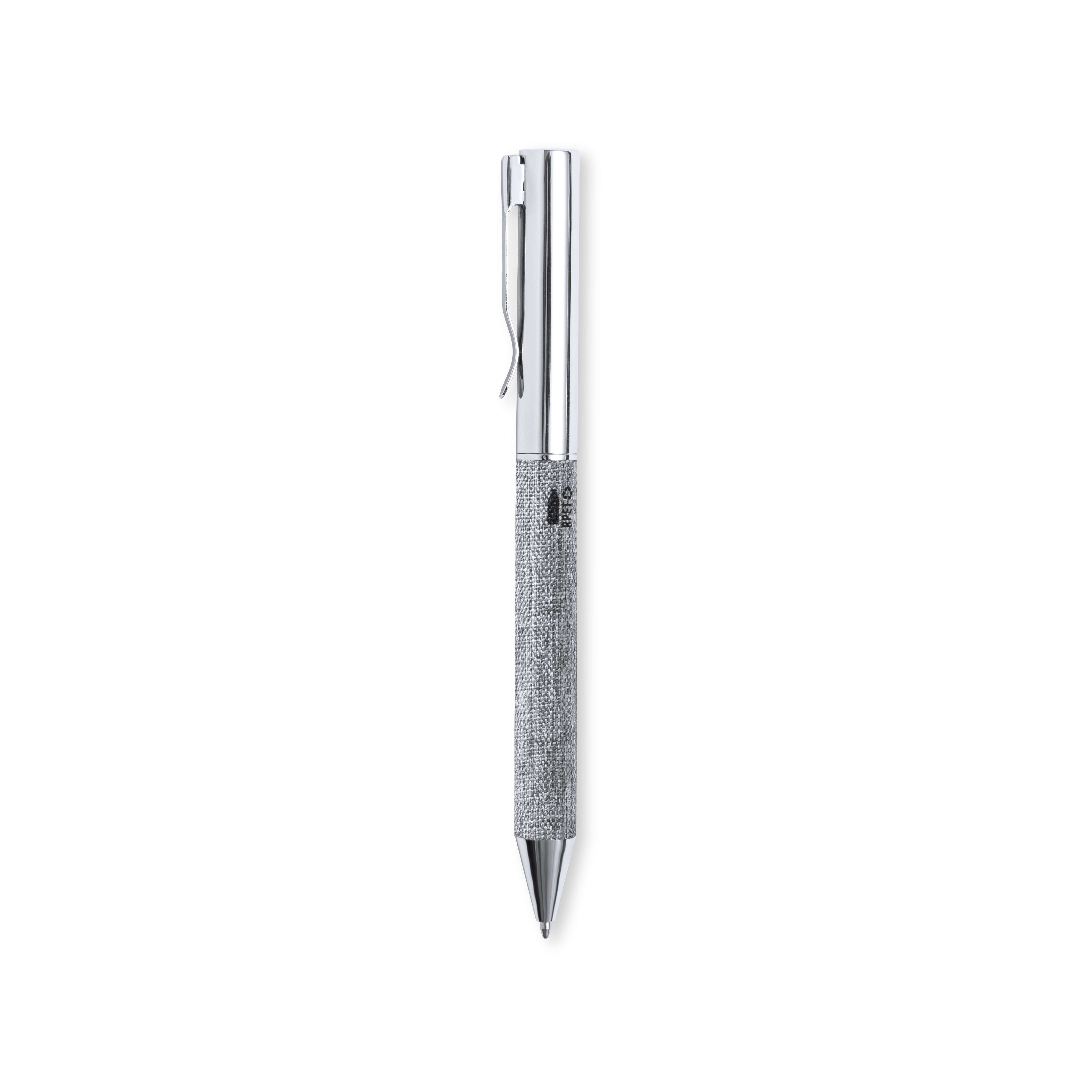 Penna in metallo cromato e fusto rivestito in poliestere RPET, realizzato con plastica riciclata per favorire il riutilizzo dei rifiuti plastici e contribuire alla sostenibilità del pianeta. Elegante clip in metallo e dettagli coordinati, meccanismo girevole e inchiostro blu. Con etichetta distintiva RPET sul fusto e presentata in un astuccio kraft con custodia coordinata.
