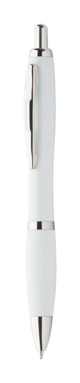 Penna a sfera in plastica ABS riciclata con refill blu, impugnatura in colore coordinato e parti cromate.