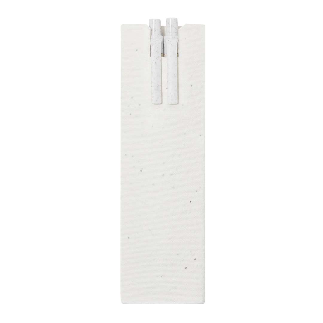 Set di penna e matita eterne realizzati con cartoni di latte riciclati, presentati in custodia di carta con semi. Penna a sfera con inchiostro blu e matita con punta eterna, per usare sempre la stessa matita e non generare rifiuti, entrambi con meccanismo a pulsante e clip coordinato realizzati in canna da grano, con distintivo inciso. Con distintivo di cartone di latte riciclato nel corpo. La custodia include semi di petunia, trasformandola in carta piantabile alla fine della sua vita utile. Include istruzioni di piantagione sulla copertina posteriore.I cartoni di latte sono composti principalmente da cartone e alluminio. Durante il processo di riciclo, si separano i vari materiali dell'imballaggio per il loro riutilizzo e nuovo utilizzo, contribuendo così a percorrere il cammino infinito dell'economia circolare. Questo materiale si caratterizza per il suo alto grado di riciclabilità, così come per la sua leggerezza e resistenza.La canna da grano incoraggia l'uso di materie prime naturali, riducendo così le emissioni inquinanti.