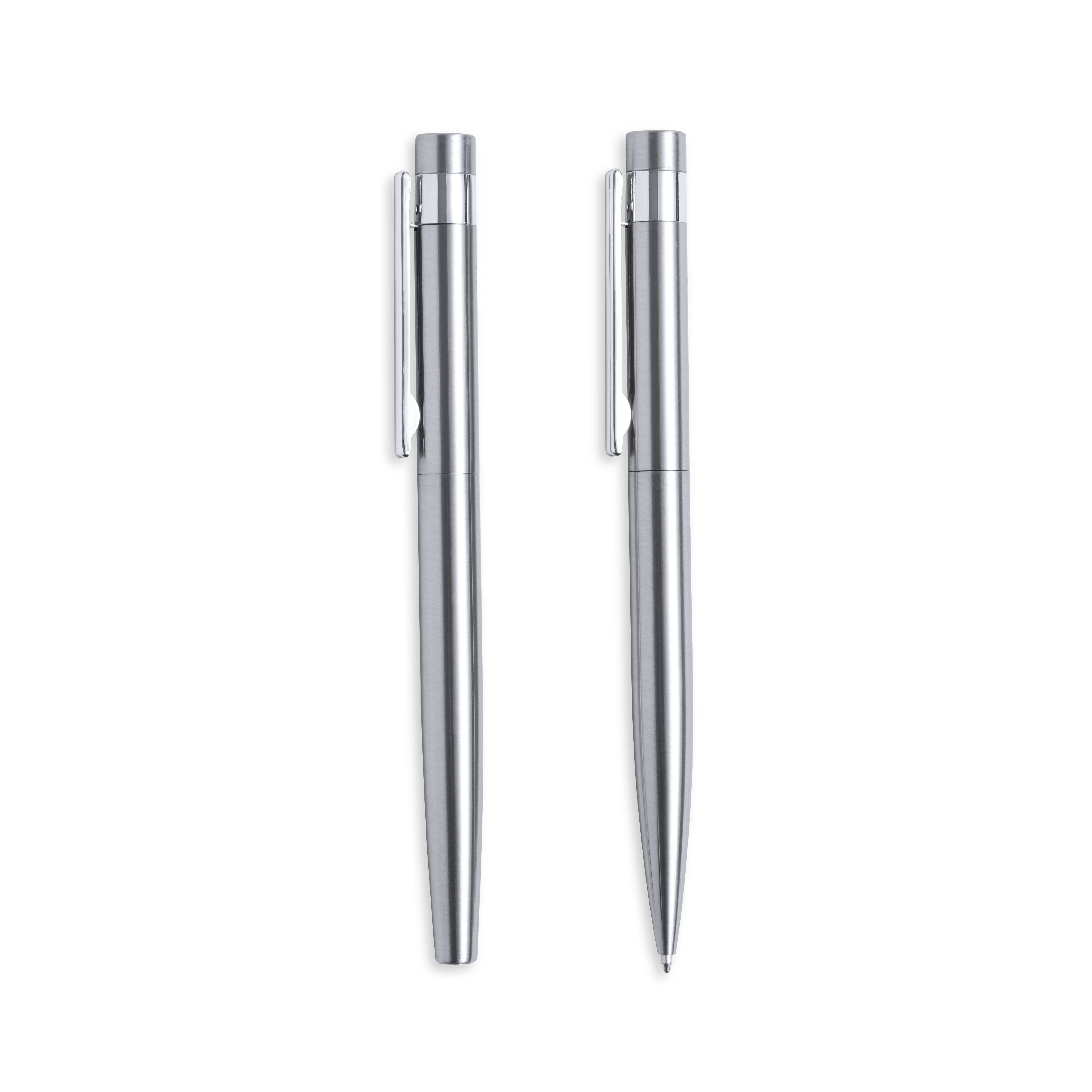 Set ecologico di penna e roller, in acciaio inossidabile riciclato. Include: Penna con meccanismo a rotazione, fusto con rifinitura argentata e dettagli cromati. Clip in metallo e etichetta acciaio inossidabile riciclato sulla parte superiore della penna. Cartuccia Jumbo e inchiostro blu.Roller con fusto color argento e finiture cromate. Clip in metallo e etichetta acciaio inossidabile riciclato sulla parte superiore del cappuccio. Cartuccia Jumbo e inchiostro blu.Il set è presentato in un astuccio individuale di design kraft con custodia abbinata.L'acciaio è uno dei materiali più ricercati e si trova praticamente ovunque, dai prodotti di uso quotidiano alle grandi costruzioni. Le sue innumerevoli proprietà, tra cui la durata e l'alto grado di riutilizzabilità, lo rendono un'alternativa molto apprezzata per le soluzioni di sostenibilità. Se trattata correttamente, permette di ottenere nuove risorse di uso infinito.