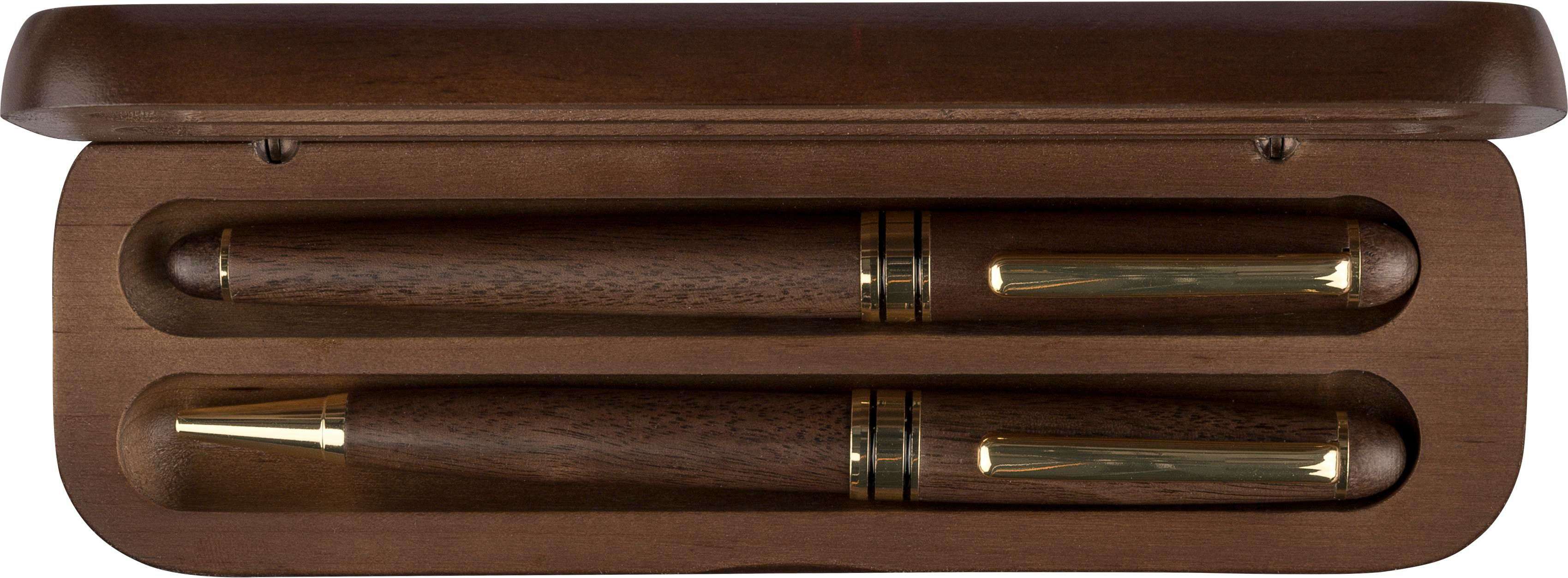 Set scrittura in legno di noce ed ottone, composto da penna a sfera twist con punta, clip e dettagli in metallo e rollerball, entrambe con inchiostro German Ink Dokumental, la penna a sfera ha una lunghezza di scrittura di circa 1.000 metri, il rollerball fino a 400 metri, fornito in comodo astuccio in legno di acero e cartone avana, refill blu.