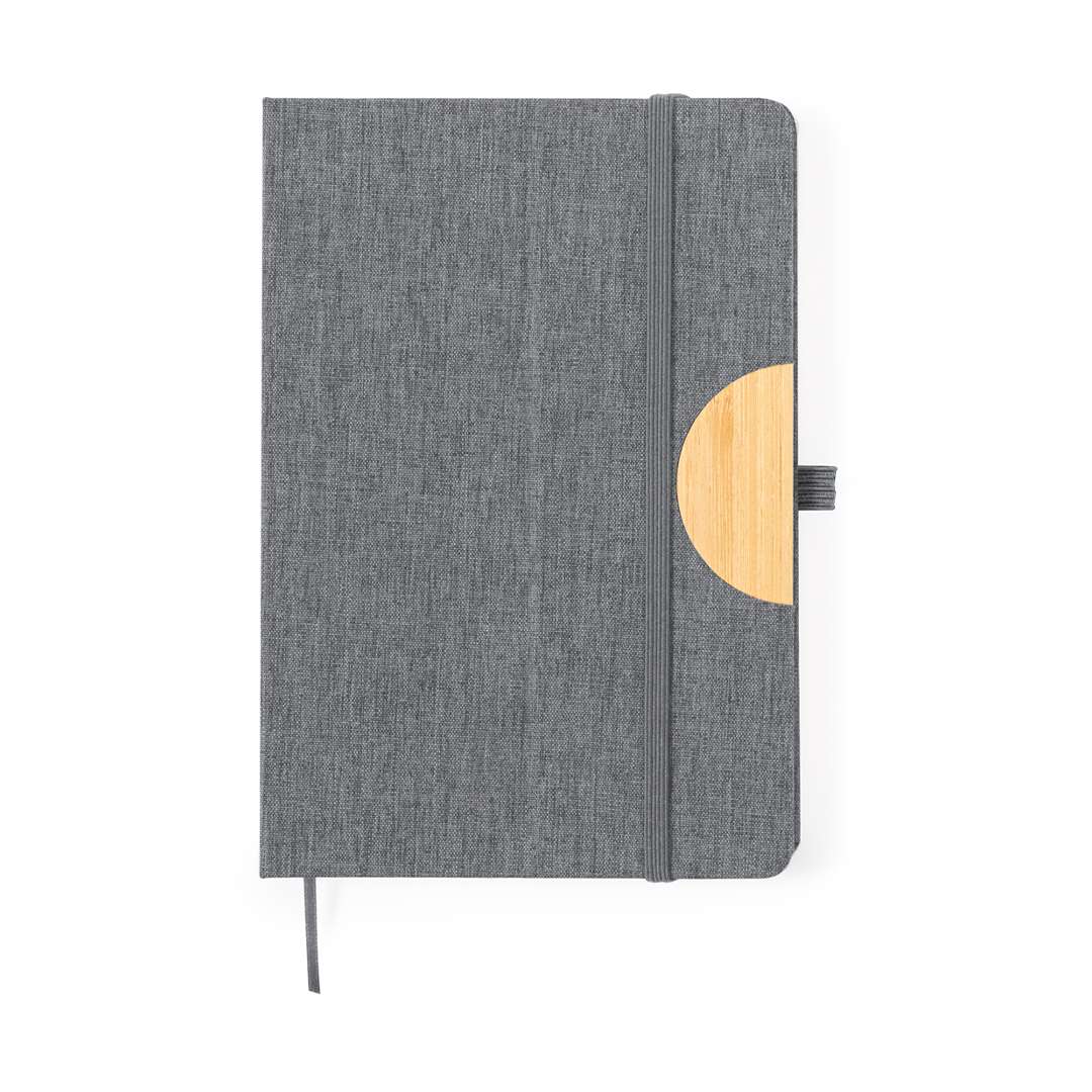 Block notes supporto con copertina rigida in RPET 300D e bambù. Versatile supporto integrato nella copertina per smartphone e tablet, realizzato in bambù. Presenta una chiusura elastica e un portapenne coordinato. Contiene 80 pagine interne lisce ed è disponibile in un'ampia gamma di colori. Con logo RPET sul retro della copertina e presentato in una busta individuale di carta riciclata.Il materiale RPET è realizzato con plastica riciclata per incoraggiare il riutilizzo dei rifiuti plastici e contribuire alla sostenibilità del pianeta.