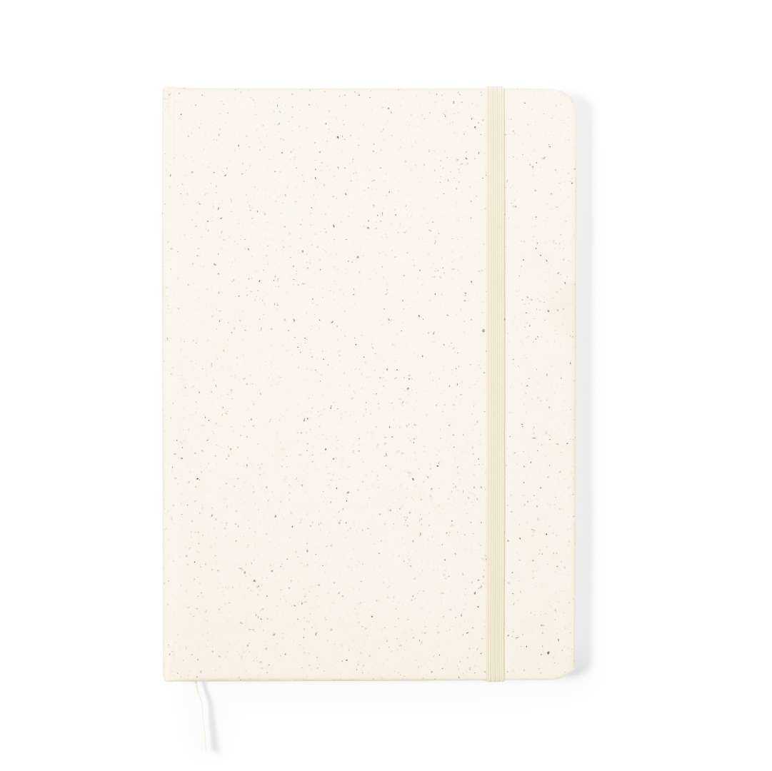 Block notes A5 con copertina rigida in robusto cartone riciclato. Con 100 fogli bianchi lisci ed elastico di chiusura. Presentato in busta individuale riciclata.