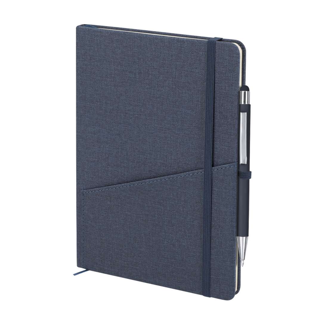 Taccuino con copertina rigida in PU Riciclato, finitura lino. Con pratico taschino frontale, portapenne, segnalibro abbinato e fascia elastica di chiusura. Include 80 fogli color crema a righe. Con distintivo in PU Riciclato. Il PU Riciclato si distingue per la sua resistenza ed elasticità. Questo materiale riciclato e riciclabile è unopzione sostenibile che recupera le fibre scartate nei processi di produzione, riducendo al minimo gli sprechi di materiale e contribuendo a diminuire limpatto ambientale, mantenendo al tempo stesso le sue proprietà originali.