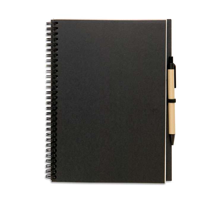 Notebook in carta riciclata con penna. Doppia spirale. 140 pagine di carta riciclata normale (70 fogli). Penna a sfera a pulsante in cartone riciclato e plastica biodegradabile. Inchiostro blu. Portapenne elastico nero. FSC MIX CREDIT | P7.1 | FSC-C213206