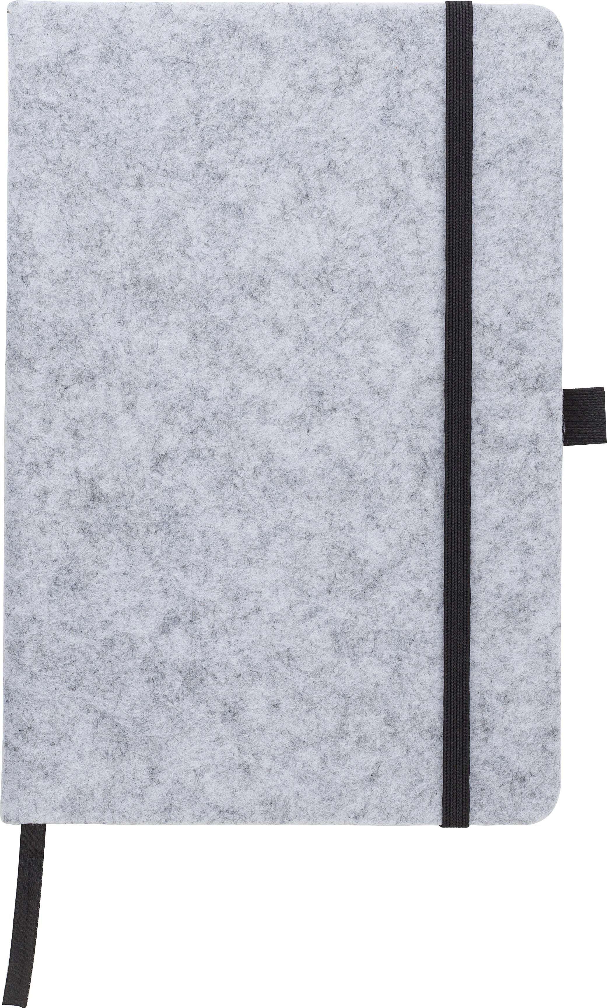 Taccuino in feltro rPET, formato +/- A5, 160 pagine a righe, passante per penna, elastico e segnalibro