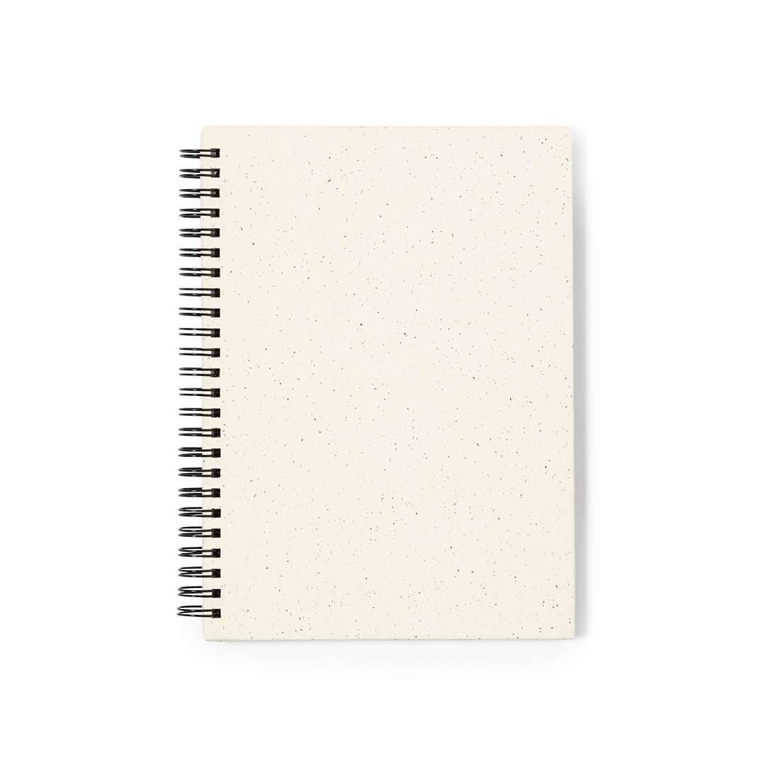 Taccuino ad anelli A5 con copertina rigida in robusto cartone riciclato. All'interno 80 fogli bianchi lisci 100% riciclati. Presentato in busta individuale riciclata.