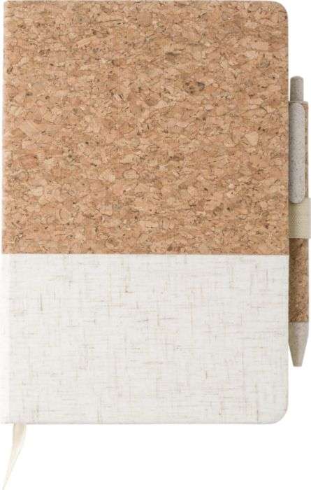 Taccuino in sughero e lino, formato +/- A5, 80 pagine a righe con notifica della data, include penna a sfera in sughero e paglia di grano, con passante, refill blu