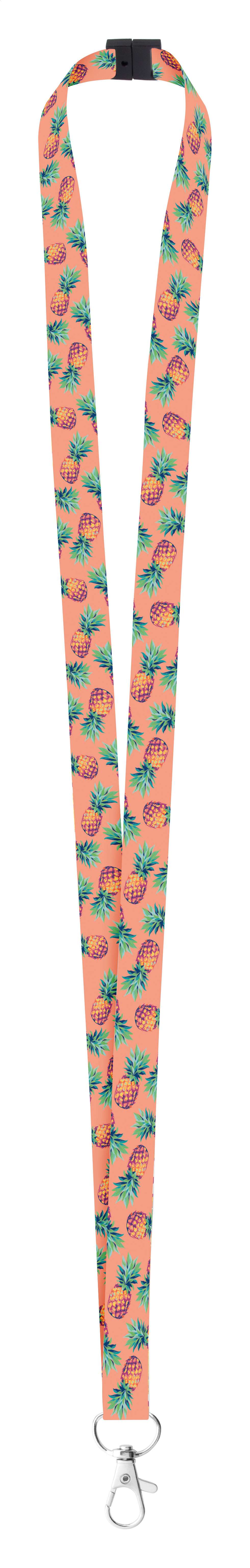 Lanyard in poliestere largo 15 mm con moschettone metallico e fibbia di sicurezza. Con grafica stampata in sublimazione su entrambi i lati. Prodotto su richiesta. MOQ: 100 pezzi.