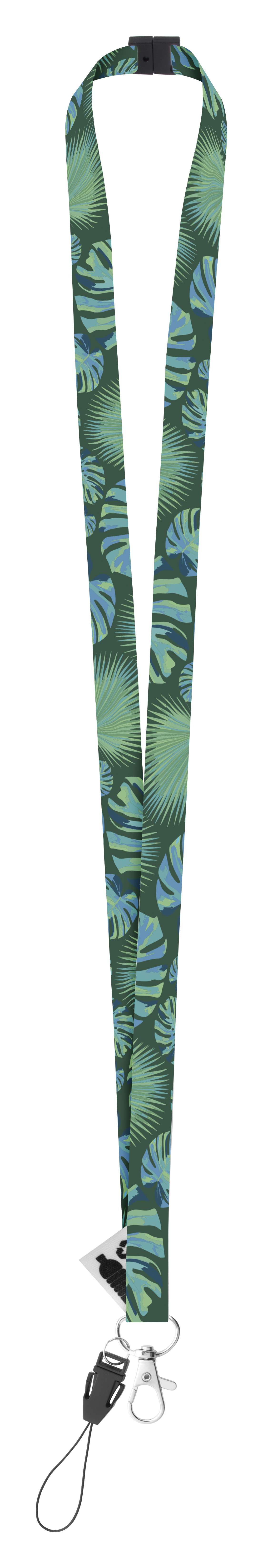 Lanyard in RPET da 15mm personalizzabile, con moschettone in metallo, cordino per cellulare e chiusura di sicurezza, stampa in sublimazione su entrambi i lati. MOQ: 100pz