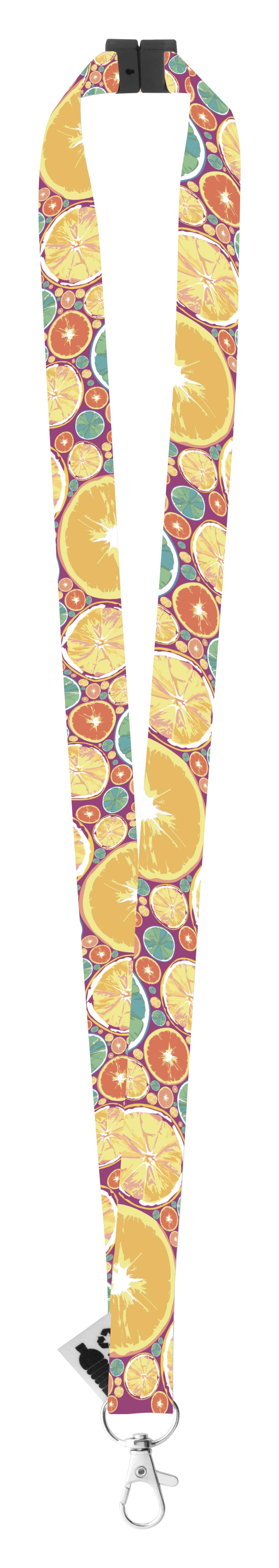 Lanyard in RPET personalizzabile, con moschettone in metallo e chiusura di sicurezza, stampa in sublimazione su entrambi i lati. MOQ: 100pz.