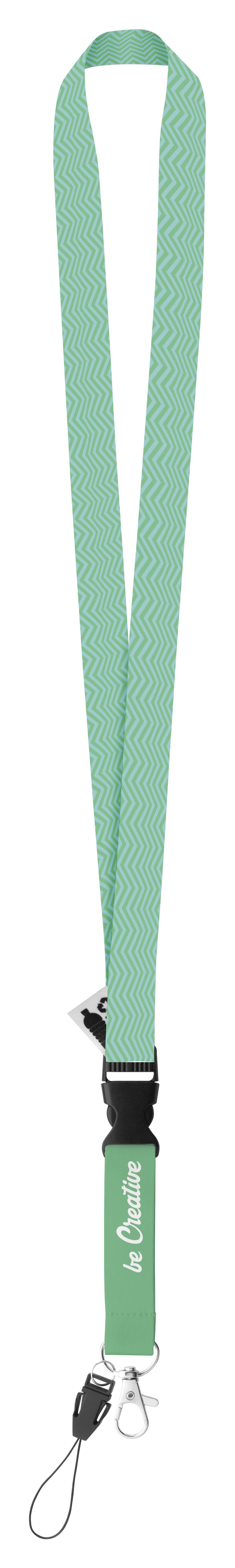 Lanyard in RPET personalizzabile, con moschettone in metallo staccabile e cordino per cellulare, stampa in sublimazione su entrambi i lati. MOQ: 100 pezzi.