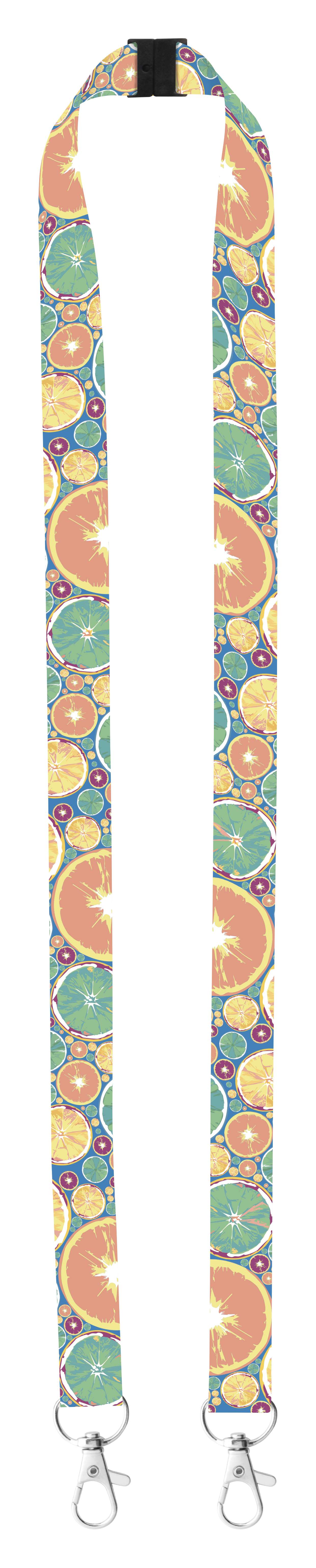 Lanyard in poliestere con 2 moschettoni metallici e fibbia di sicurezza. Con grafica stampata in sublimazione su entrambi i lati. MOQ: 100 pezzi.