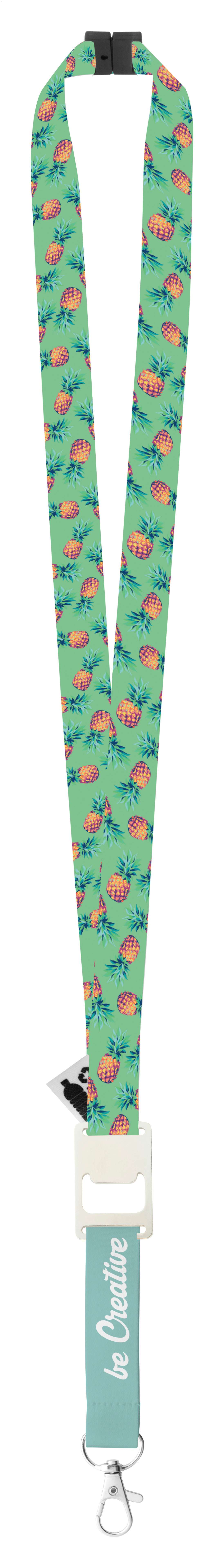 Lanyard in RPET personalizzabile, con moschettone in metallo, apri bottiglie e fibbia di sicurezza, stampa in sublimazione su entrambi i lati. MOQ: 100pz.