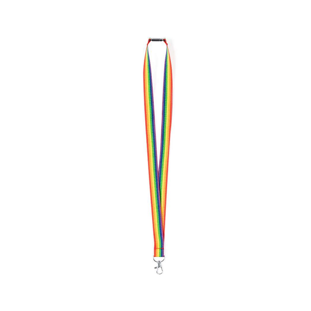 Lanyard Rainbow multicolore, realizzato in morbido poliestere. Con moschettone girevole in metallo e attacco di sicurezza al collo. Un vero orgoglio di cordino.