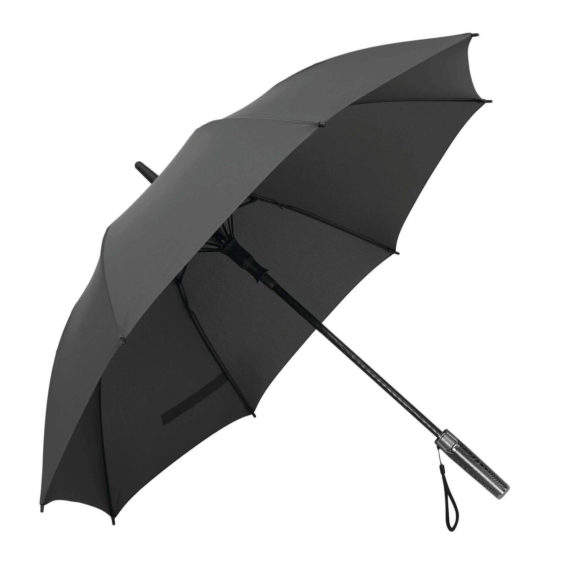 Ombrello automatico BLIZZARD: Asta e stecche in fibra di vetro, punta in plastica, manico in plastica con finitura effetto carbonio con pulsante automatico integrato e cordino da polso, tessuto in poliestere pongee di alta qualità, nastro di chiusura a pressione