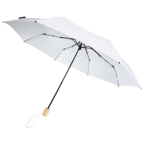 Ombrello pieghevole con apertura manuale realizzato in stoffa di poliestere pongee in PET riciclato e manico in legno. Robusto fusto in metallo e telaio di alta qualità con stecche in fibra di vetro per la massima flessibilità in condizioni di vento. Fornito con custodia, può essere facilmente inserito in una borsa o uno zaino per un comodo trasporto. Grazie all'impugnatura in legno e alla stoffa in poliestere pongee in PET riciclato offre una scelta più sostenibile.