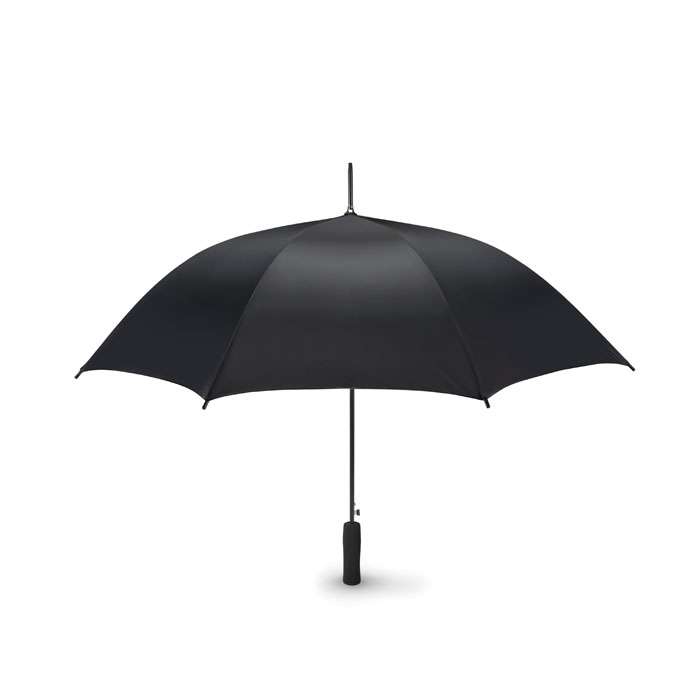 Ombrello automatico da 23 inch in pongee 190T. Struttura in metallo placcata nera. Punte in plastica nera. Manico dritto in EVA nero. Chiusura manuale.