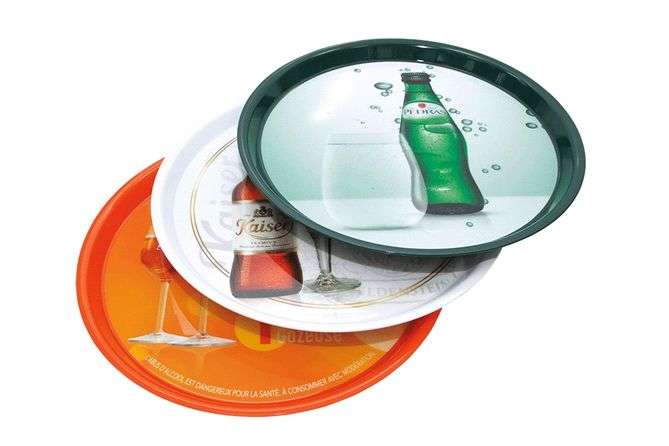 Vassoio personalizzato in plastica con superficie antiscivolo e bordo basso personalizzabile in modo indelibile con grafica da un colore a quadricromia. Dimensioni delle etichette: parte superiore: Ø334mm, parte inferiore: Ø 326mm + ø 8 mm. ORDINE MINIMO 100 PEZZI.