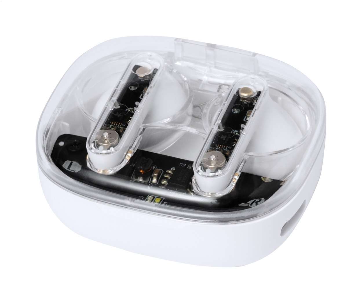 Auricolari stereo true wireless (TWS) semitrasparenti con componenti elettronici visibili e funzione di chiamata in vivavoce. In custodia di plastica semitrasparente. Incluso cavo di ricarica USB.