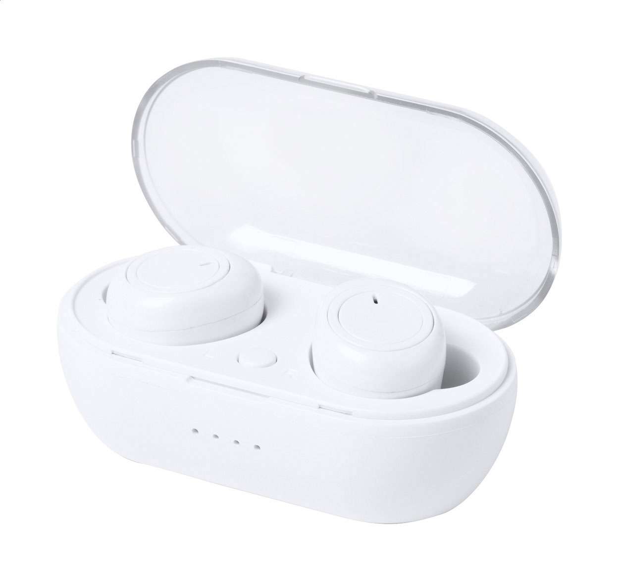Auricolari stereo true wireless (TWS) con funzione di chiamata in vivavoce in una custodia di plastica per il caricabatterie. Incluso cavo di ricarica USB.