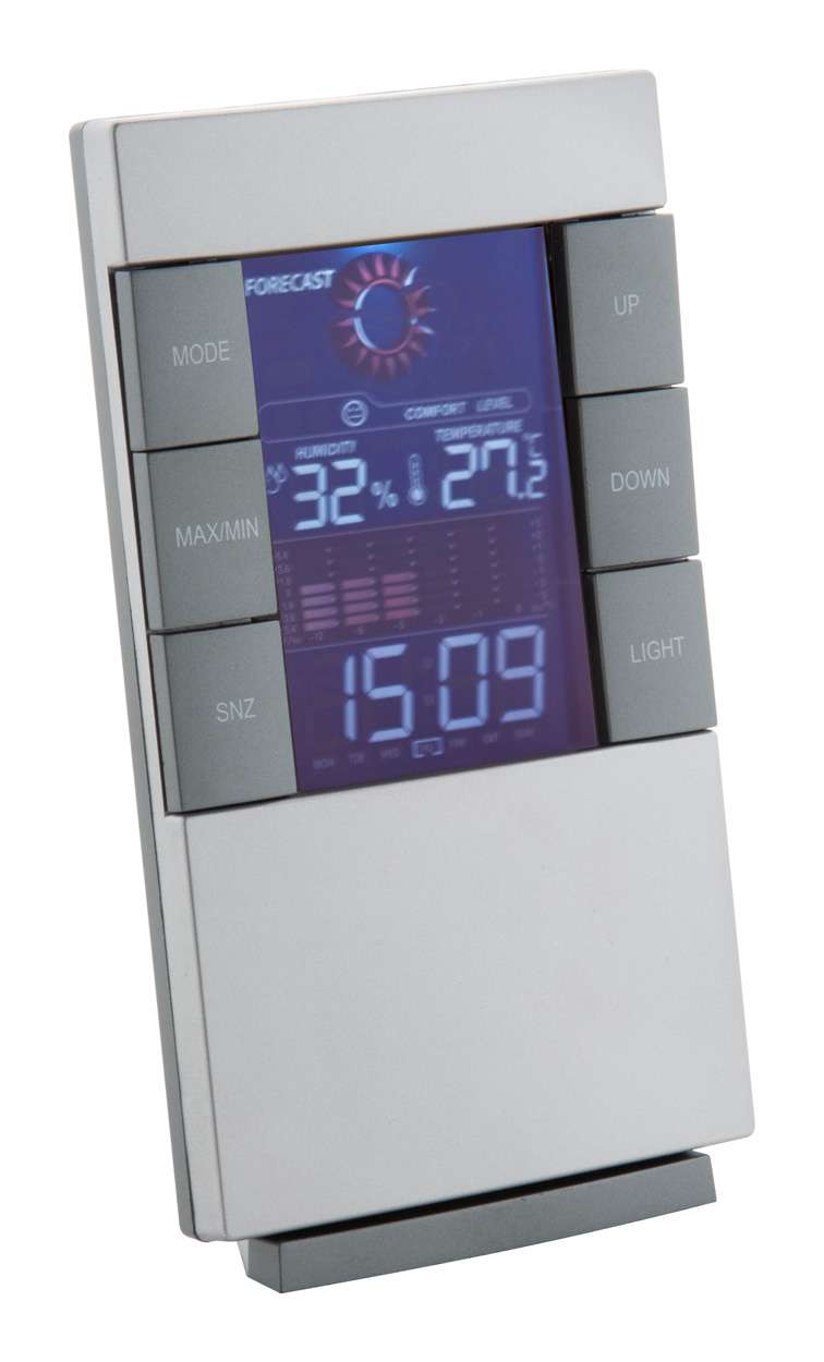 Orologio digitale e stazione meteo con display a colori Funzioni: Sveglia, termometro, igrometro e memoria andamento temperature ultime 12 ore. Funziona con 2 batterie AAA (non fornite).