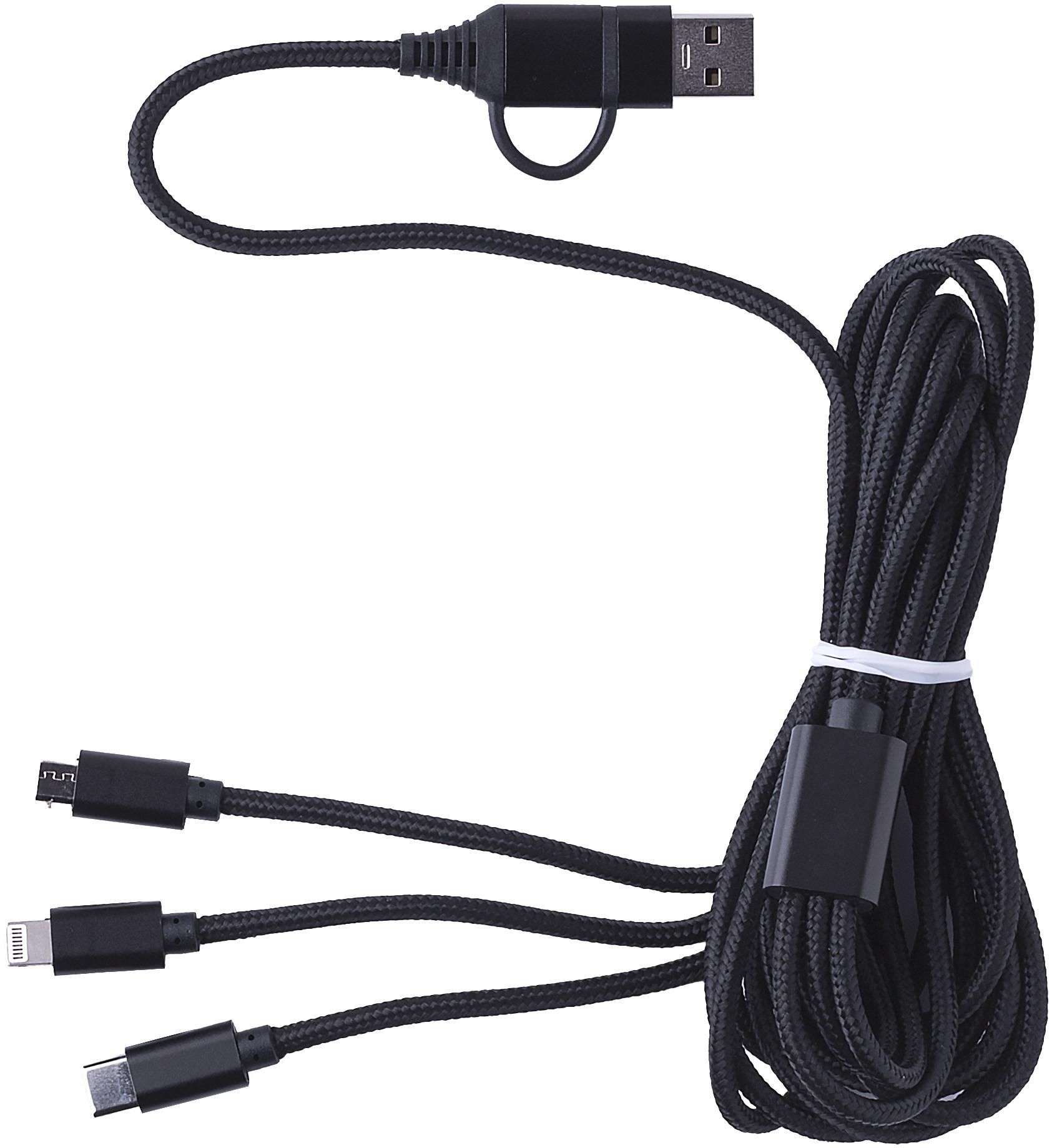 Cavo per la ricarica in nylon, velocià per la ricarcia 1.5 A, comprende connettori A+C, micro, tipo C e lightning, lunghezza del cavo circa 290 cm