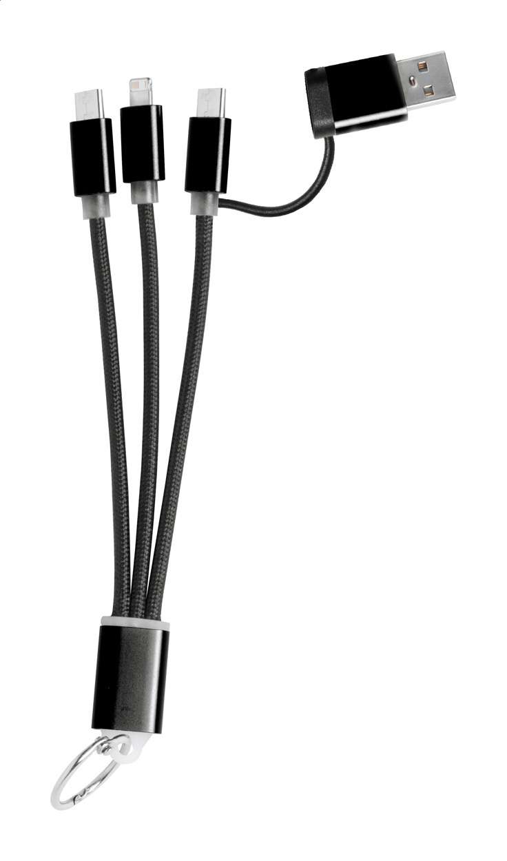 Cavo di ricarica USB in alluminio con portachiavi. Con connettori micro USB, USB-C e Lightning ed ingressi USB e USB-C.