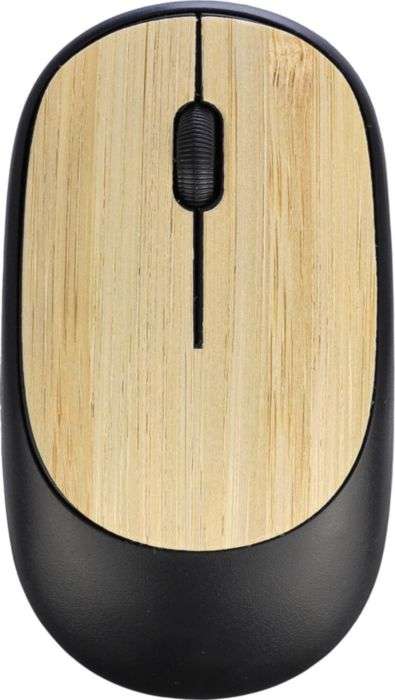 Mouse wireless in ABS con dettagli in bambù, include batteria 2,4 GHz con ricevitore USB e 1.200 DPI, confezionato singolarmente in una scatola in cartone avana