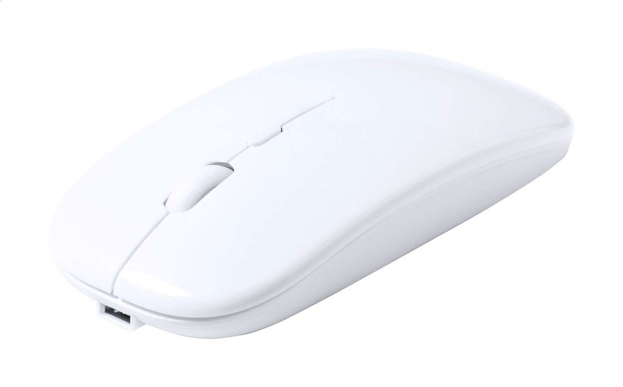 Mouse ottico wireless con scocca in ABS riciclato e batteria ricaricabile integrata. Fornito con cavo USB per la ricarica.