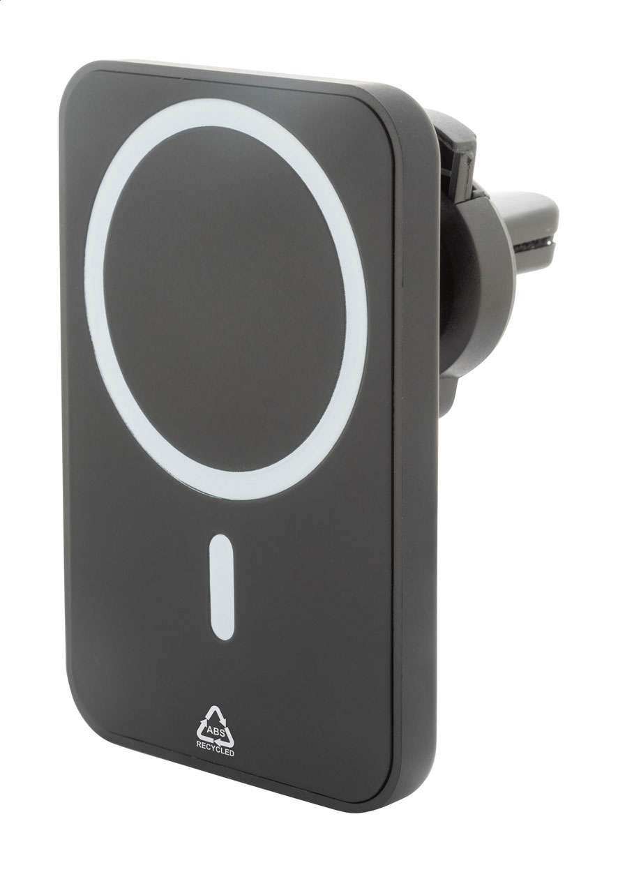 Supporto magnetico per auto in ABS riciclato con caricatore rapido wireless incorporato (15W) e supporto regolabile per il montaggio sulla bocchetta dell'aria. Include un anello metallico autoadesivo che consente l'utilizzo della funzione magnetica su qualsiasi dispositivo ricaricabile in modalità wireless. Compatibile con iPhone® 12 o più recente. Cavo di ricarica USB incluso.