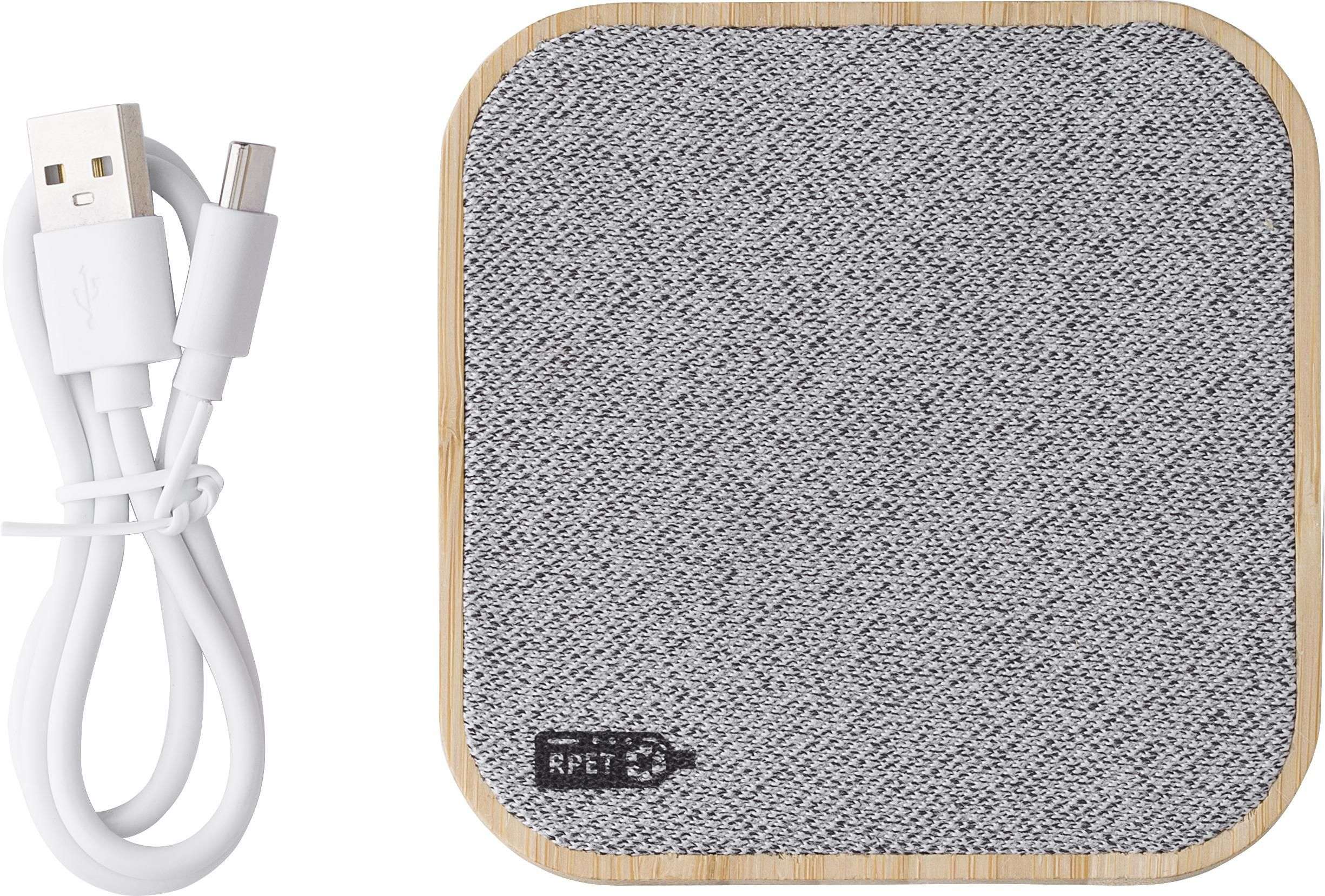 Caricabatterie wireless in bambù con dettagli RPE, ricarica rapida 15 W, confezionato singolarmente in una scatola in cartone avana