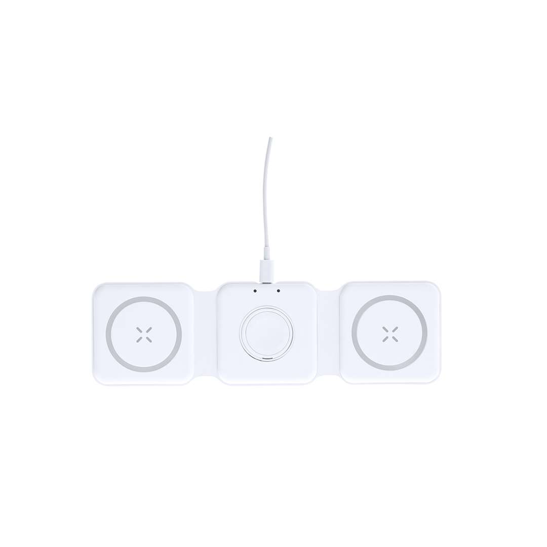 Caricatore wireless magnetico completo 15W, progettato per la ricarica simultanea di smartphone, auricolari e smartwatch. Un gadget tutto-in-uno: pieghevole, portatile, compatto nelle dimensioni, molto versatile e funzionale nel design. Connessione tramite USB Tipo C -cavo incluso- e realizzato in ABS resistente di colore bianco.Prodotto secondo gli standard RoHS e in conformità con i seguenti requisiti di sicurezza:Sistema di protezione contro il surriscaldamento.Sistema di protezione contro il sovraccarico.Sistema di blocco per evitare cortocircuiti.