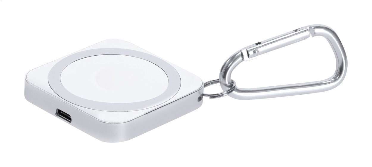 Rapido caricabatterie magnetico wireless (15W) corpo in alluminio e moschettone. Progettato per ricaricare smartphone, auricolari e smartwatch. Compatibile con iPhone® 12 o più recente.