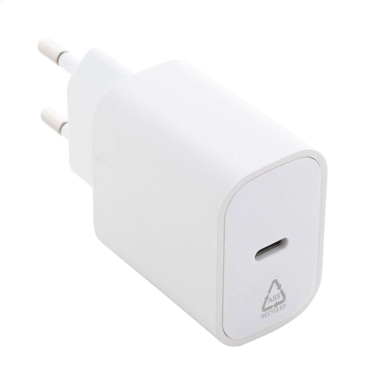 Caricatore da parete USB a ricarica rapida in ABS riciclato 1 porta USB-C, con spina europea a 2 poli e tecnologia di ricarica rapida (PD20W / QC3.0).
