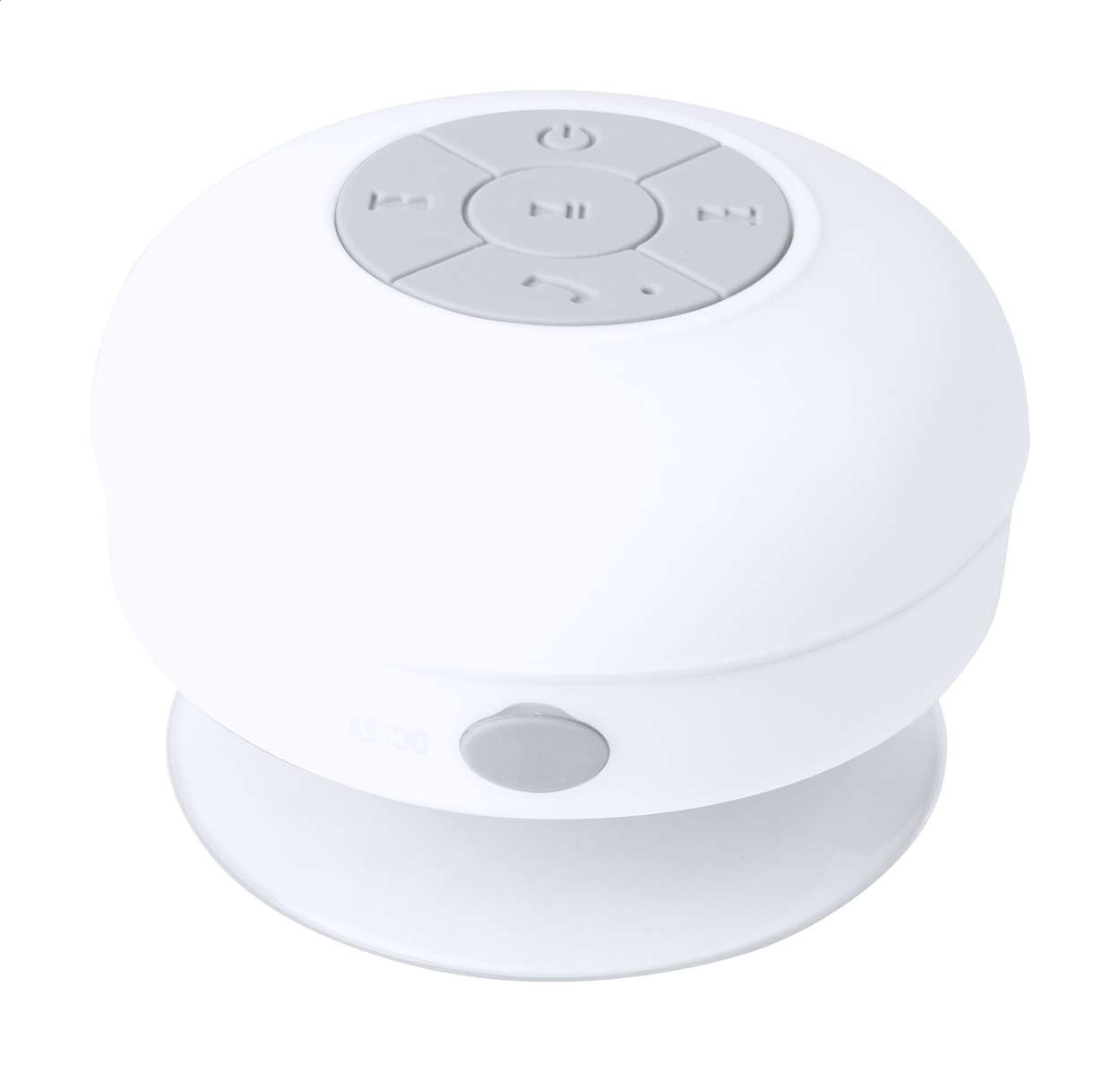 Altoparlante wireless con alloggiamento rivestito in gomma e ampia ventosa. Con funzione di chiamata in vivavoce e batteria ricaricabile integrata. Cavo di ricarica USB incluso.