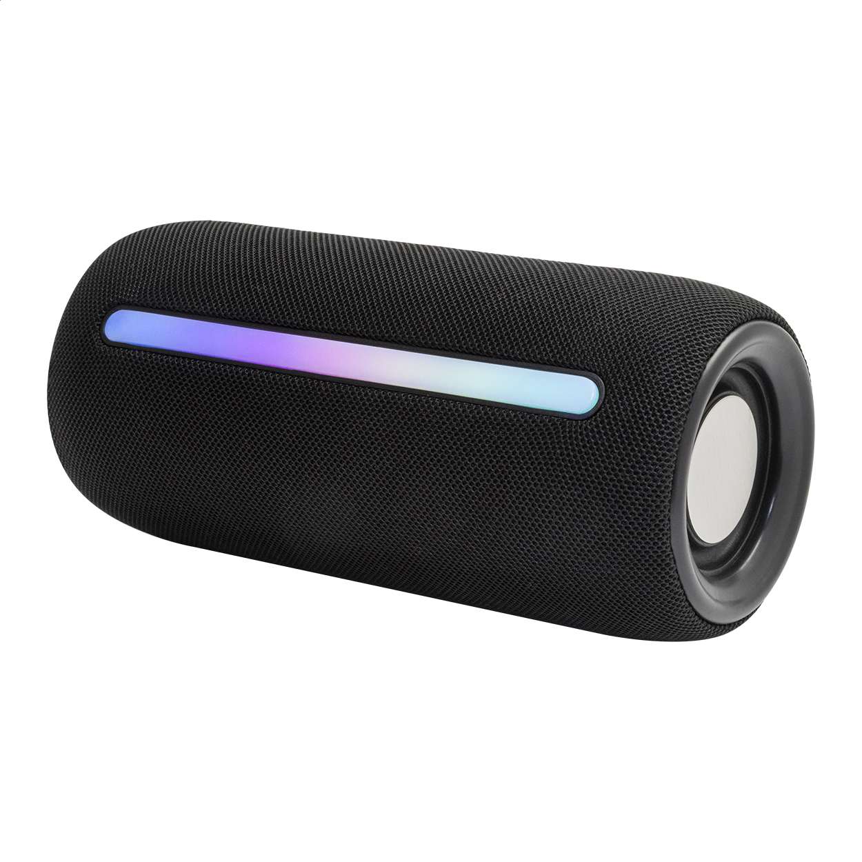 Altoparlante wireless rivestito in tessuto di poliestere con luce LED multicolore e cinghia di trasporto. Con 2 altoparlanti, funzione di chiamata in vivavoce e batteria ricaricabile integrata (1200 mAh). Cavo di ricarica USB incluso.