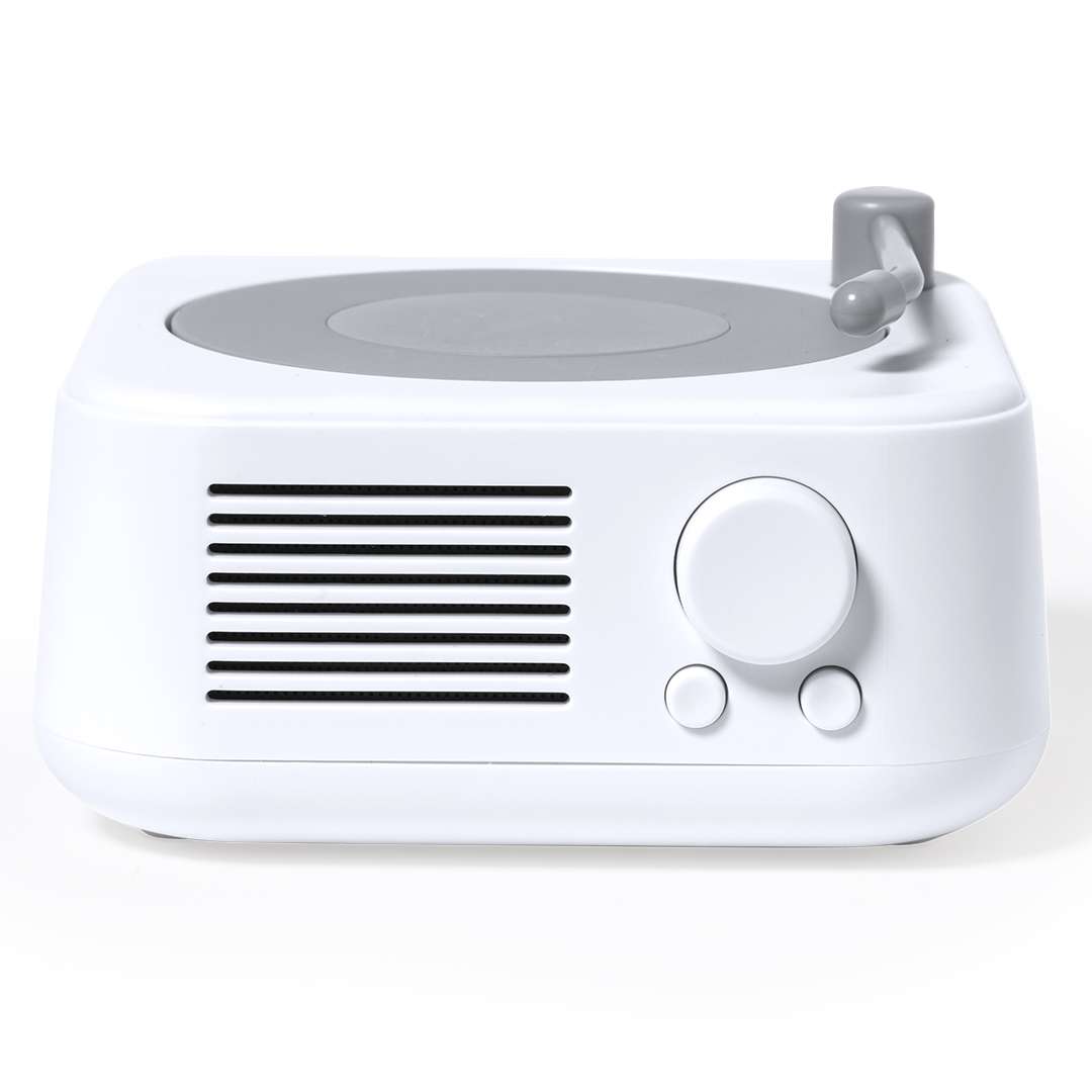 Altoparlante Bluetooth® a forma di giradischi originale, dimensioni compatte e potenza di 5W. Batteria al litio da 800 mAh, con cavo di ricarica Type-C incluso e indicatore luminoso dello stato di carica. Funzione vivavoce e radio FM, con slot per schede micro SD fino a 32 GB e ingresso ausiliario per jack da 3,5 mm. Realizzato in resistente ABS bianco con accenti grigi e presentato in una scatola individuale dal design kraft, con manuale di istruzioni in inglese e spagnolo.