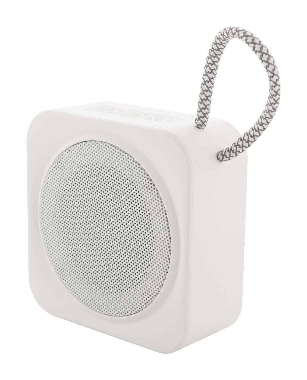 Cassa wireless in ABS riciclato con griglia metallica, batteria ricaricabile (300 mAh) e funzione di riproduzione micro SD MP3. Cavo di ricarica USB incluso.