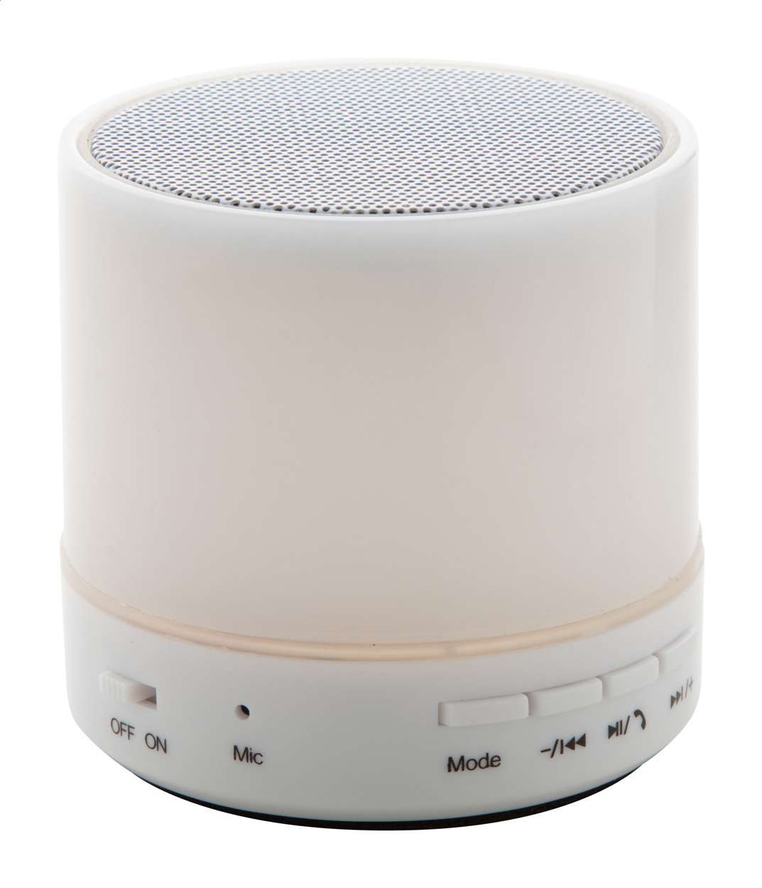 Altoparlante wireless con alloggiamento in plastica e luce LED multicolore. Con funzione di chiamata in vivavoce, radio FM e batteria ricaricabile integrata. Incluso cavo di ricarica USB.