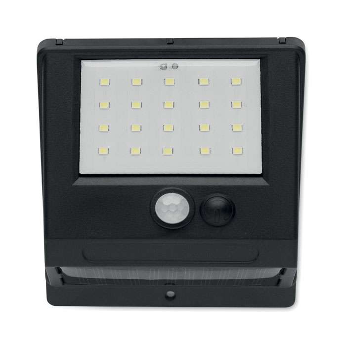 Lampada solare a 20 LED in PP con sensori di movimento PIR (Passive Infrared Sensor) e notturni (CDS). Grado di protezione: IP 44. Capacità della batteria: 800 mAh.
